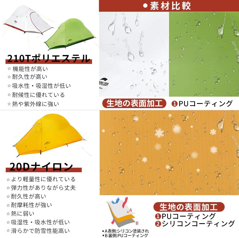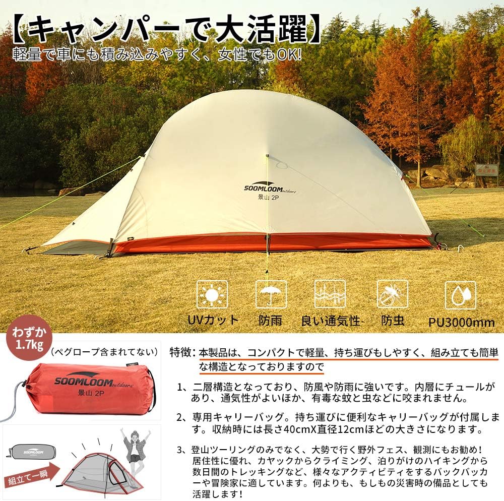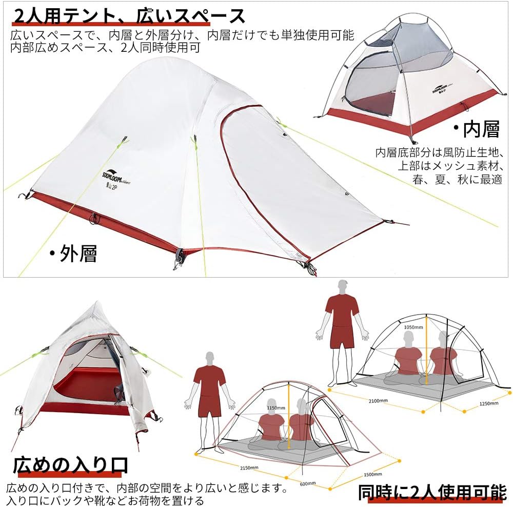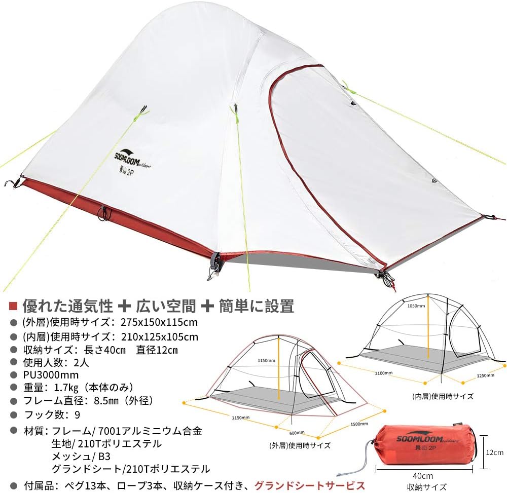 内容(Amazonより): 組立サイズ(外寸):(約)W230×D375×H140cm 収納サイズ(:約)直径23×長さ65cm インナーサイズ(:約)W210×D210×H115cm 重量(付属品含む):(約)6kg 最低耐水圧:アウターテント: 3000mm フロア: 5000mm 材質:アウターテント: 75Dポリエステル(PUコーティング)、インナーテント:ポリエステル通気性生地、フロア: 210Dポリステル(PUコーティング)、ポール:アルミ合金