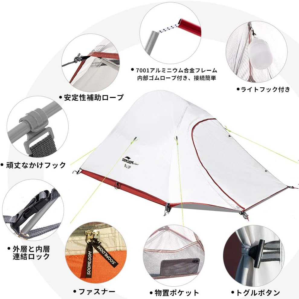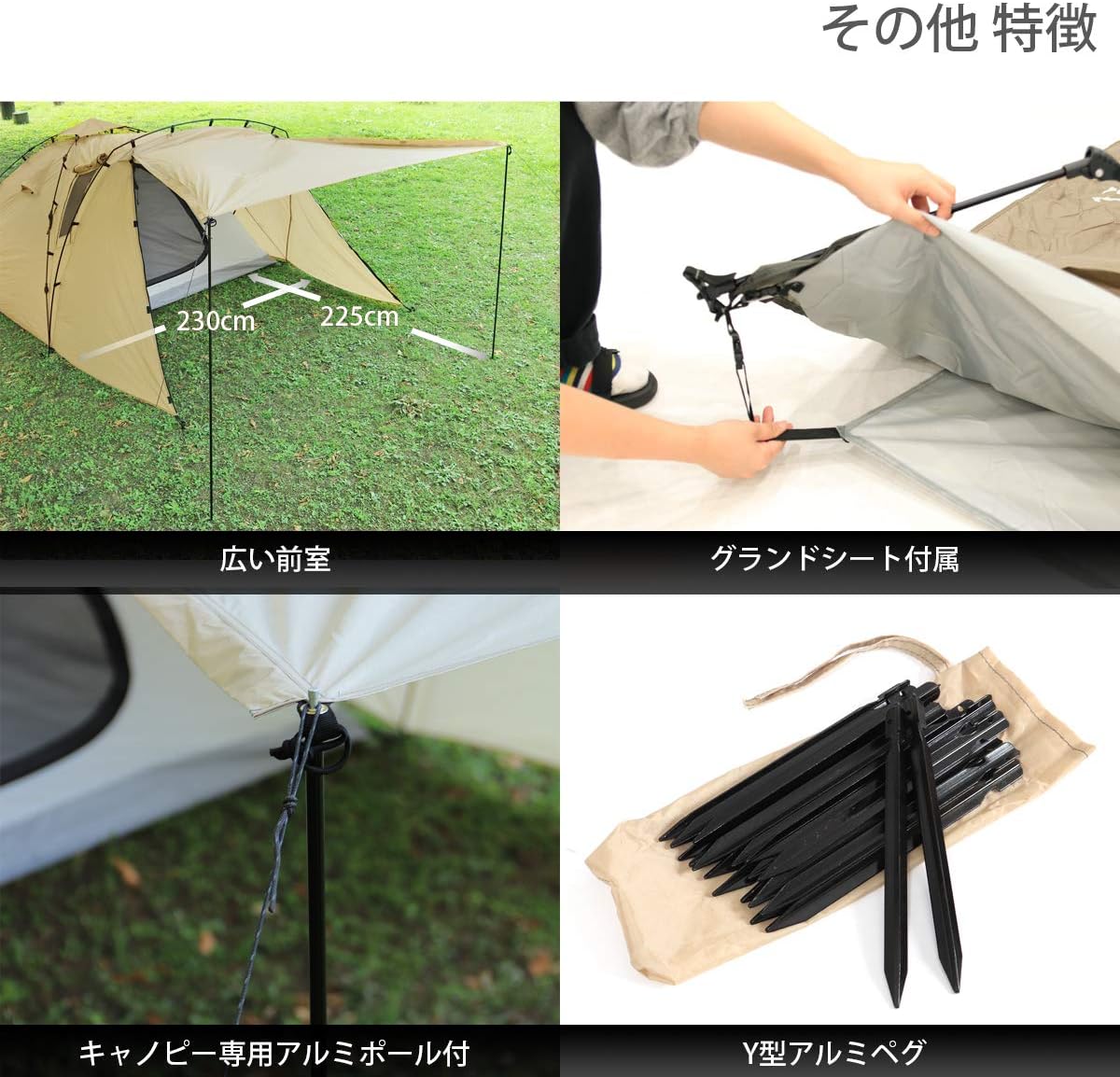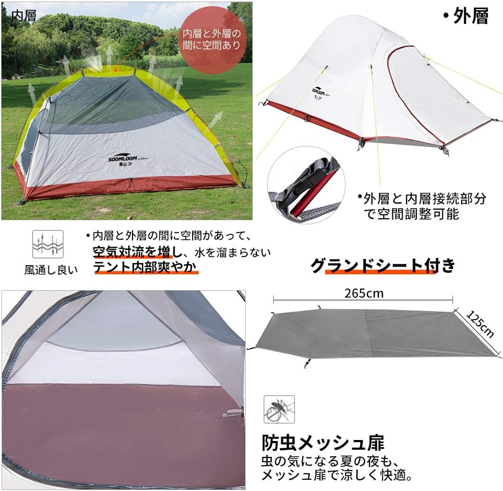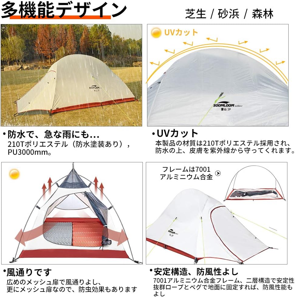 内容(Amazonより): 組立サイズ(外寸):(約)W230×D375×H140cm 収納サイズ(:約)直径23×長さ65cm インナーサイズ(:約)W210×D210×H115cm 重量(付属品含む):(約)6kg 最低耐水圧:アウターテント: 3000mm フロア: 5000mm 材質:アウターテント: 75Dポリエステル(PUコーティング)、インナーテント:ポリエステル通気性生地、フロア: 210Dポリステル(PUコーティング)、ポール:アルミ合金