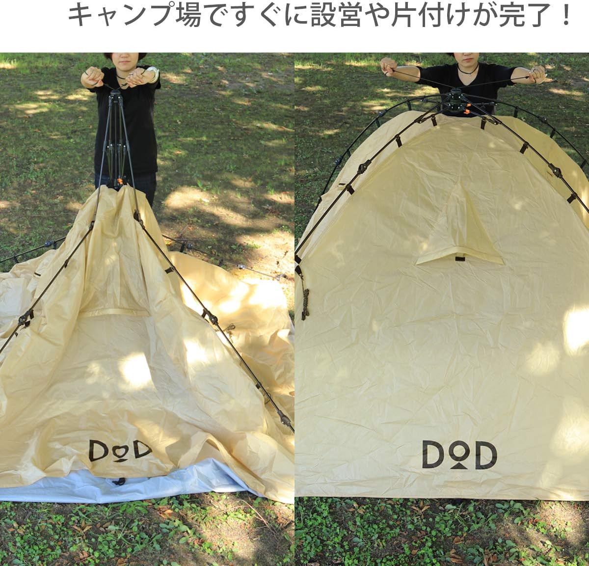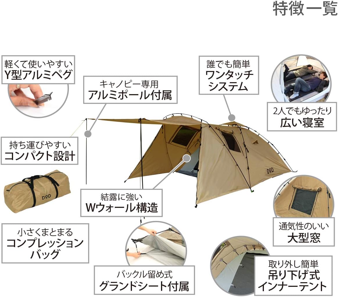 私も持っているのですが、なんといってもワンタッチ式なので、設営撤収が超楽。私のケースでは設営15分、撤収15分ぐらいで出来ています。雨の日もフロントスペースと広めのキャノピー(屋根が広がる)スペースがあるのでキャンプが十分楽しめます。その上、室内が家族3人でもなんとか使えるほどの広さがあるのがうれしいです。 ソロキャンプでも、ゆったり楽しみたい方には超おススメです。 この点とならばタープも必要なく、自宅にテントを開いて乾かすスペースがあるのならば、雨の日にキャンプにいっても大きなビニール袋にそのままたたんで撤収もOKです。 とにかく使い勝手がよく、今ソロキャンプで主に使っているテントがこれ。