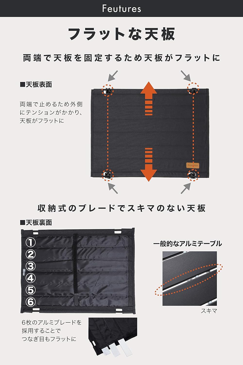 天板については、布地ですが、中にはアルミの天板が内臓されているので、天板もまっ平になってくれて、上に物を置いても安定感抜群です。ソロキャンプではランタンや、氷入れ他、キャンプ道具を置くテーブルとして非常に重宝しています。